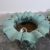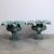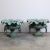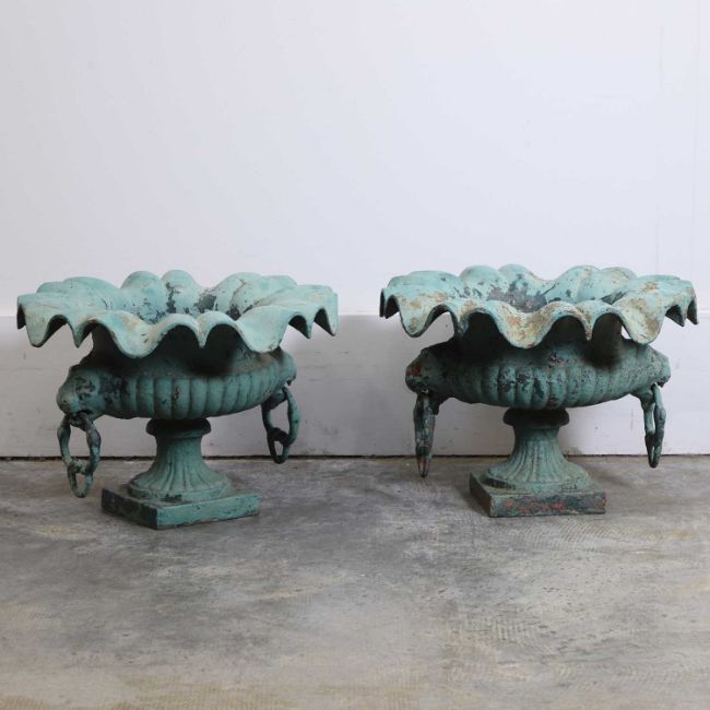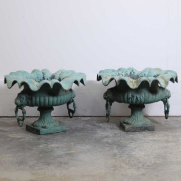 Each of squat form with a deeply scalloped rim above a fluted body, cast with opposing lion mask mounts issuing ring handles, raised on a spreading pedestal foot and square base, the surface with a green-painted finish and areas of weathering revealing underlying metal
