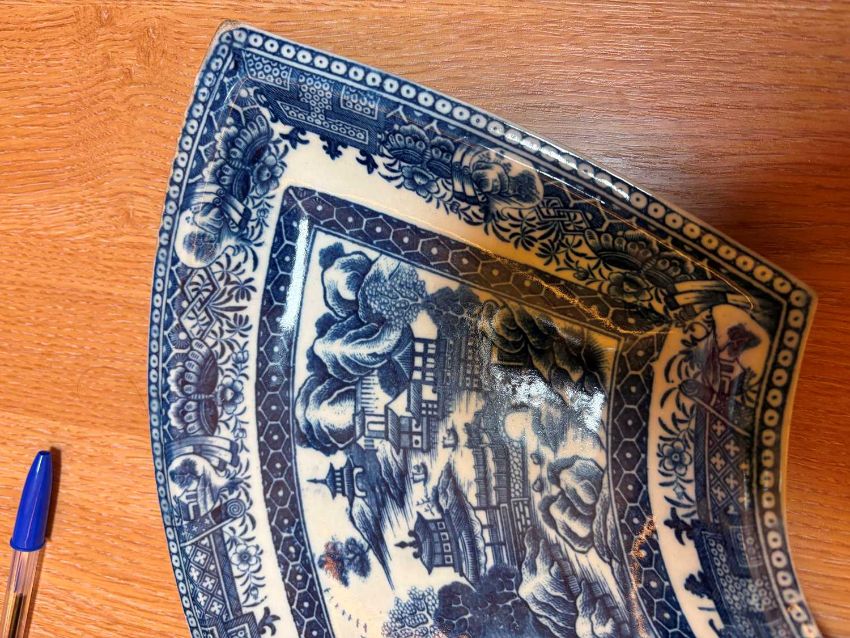 the scalloped edge enclosing four fan-shaped reserves, centre with a scene depicting a figure on a boat before a landscape, all to a powder blue ground, underglaze pseudo-Chinese marks and impressed 'Salopian'