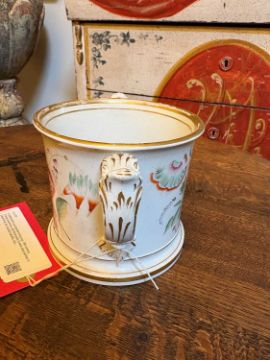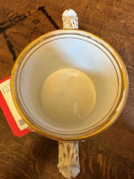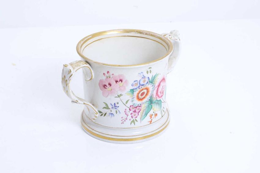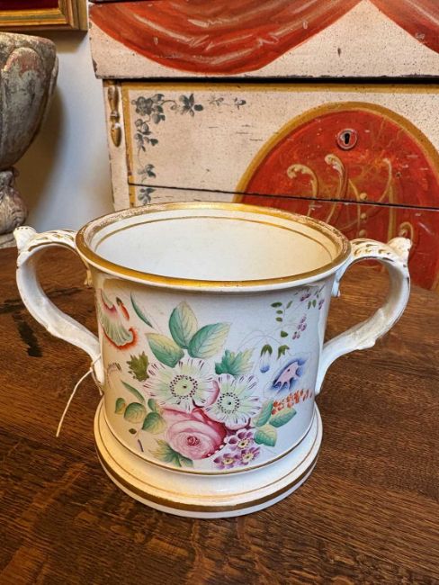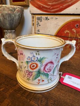 of large proportions, with floral spray to each side painted in polychrome, the moulded handles, and borders with gilt decoration