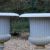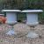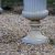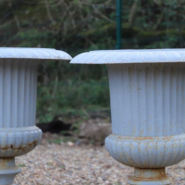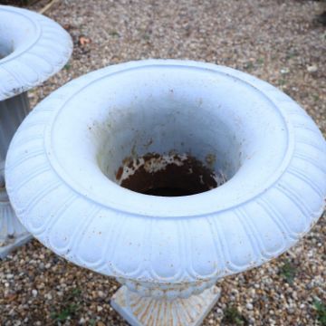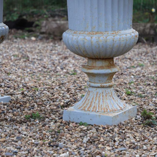 each of campana form with a broad flared rim cast with egg and dart ornament above a fluted body, raised on a knopped socle and square plinth base, the surfaces with a pale grey painted finish