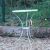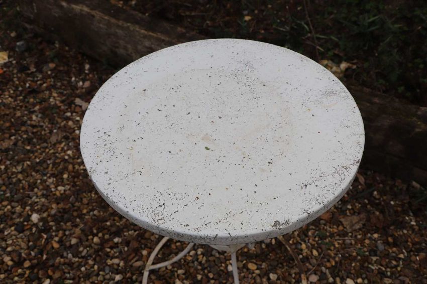 the circular top of composite stone, raised on a painted metal base with four downswept supports united by a circular stretcher