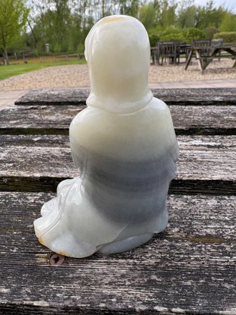 modelled robed and seated, propped up on one leg with the other beneath him, holding a pearl