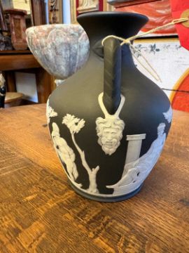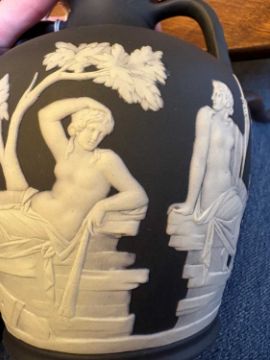 Condition Report: Firing crack to one of the handles. Firing crack to one of the lion masks. With tiny nibbles to the rim. With scuffs to the basal rim.