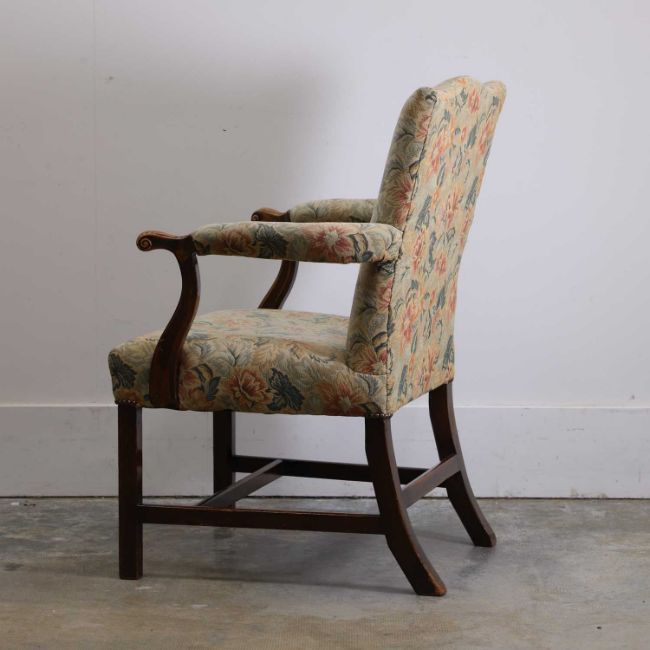 the arched back, arms and seat upholstered in foliate tapestry type fabric, the arms terminating in knurl scrolls, raised on square moulded supports united by stretchers