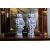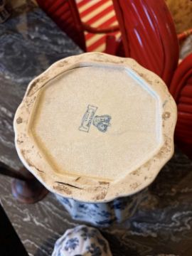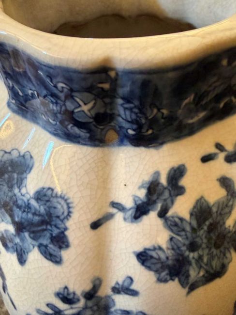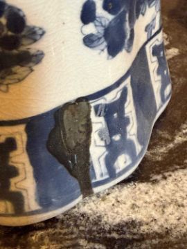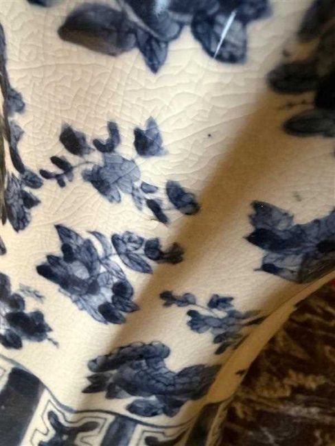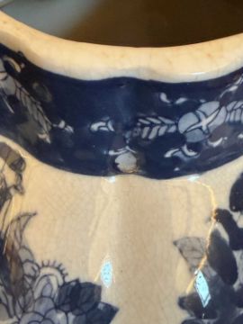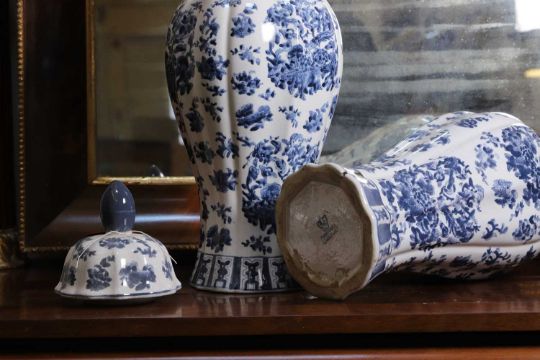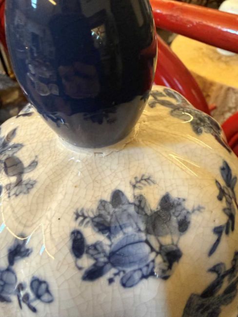 Crazing to the glaze throughout. Glazing and firing faults on both vases with some staining in areas and pitting to the glaze. One base has residue glue marks and the other with friing cracks in two places - see images. One finial broken off and reattached with residual glue visible. Historic chipping to the basal rims. Chipping to the basal rim of the lids. One large area of staining to the base of one vase - see images.