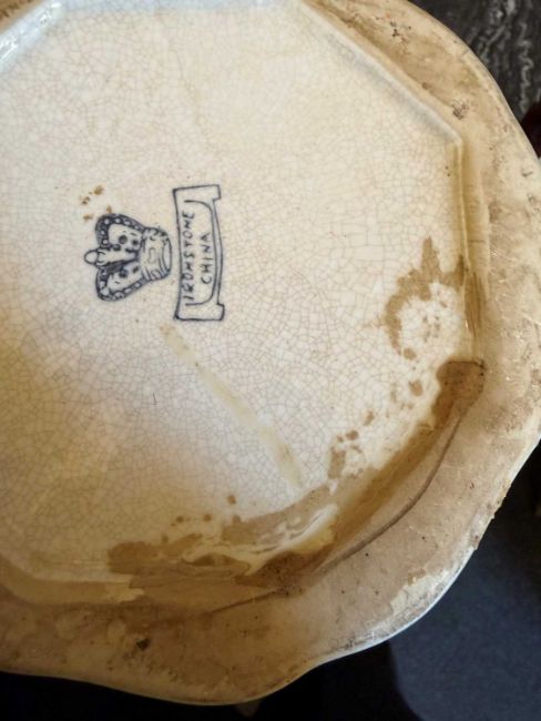Chinese style, of shaped form with covers, decorated with floral motifs, and a central circular design of birds amongst branches and flowers, with blue stamped Ironstone marks to the base