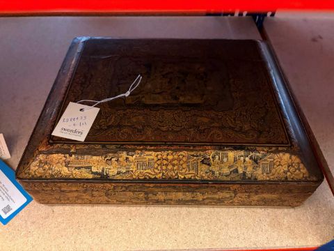 The gilt rubbed due to age and use in areas. The underside of the cover with a few splits present. A gaming counter with a chip to the rim, some slightly discoloured. the ractangular box with repairs and losses to corners and lid.