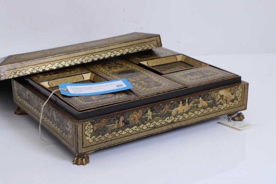 of rectangular form, accompanied by a large collection of mother-of-pearl gaming counters, painted in gilt with a stylised oval cartouche featuring figures in a garden setting, against a diapered ground, the interior with five lidded compartments and twelve trays, similarly decorated with card faces and landscape scenes