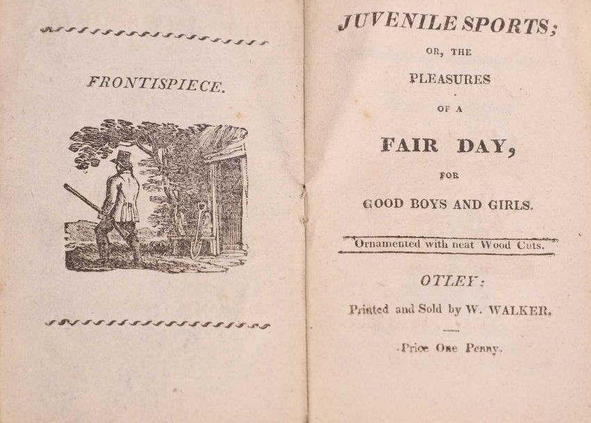 four folding segments, each segment is a double-page with an original drawing, hand-coloured and with hand written text, both to the upper and lower segments, making up a total of eight drawings (four of which are in two parts). A unique and attractive little booklet measuring: 165 mm in height and 50 mm in width (folded); 2- Juvenile sports; or the pleasures of a fair day, for good boys and girls. Otley, W Walker, no date. 15pp, original wrappers; 3- An abridgement of the holy bible. Glasgow, Lumsden, nd, C1800. 52pp, card covers; 4- A volume with Seven original drawings of trees in pencil, with a loose paper inscribed: My dear mother's drawings (4)