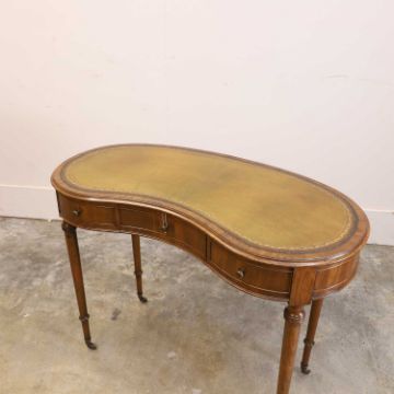 with tooled green leather writing surface heighted with gilt, above three frieze drawer, in turned tapering supports