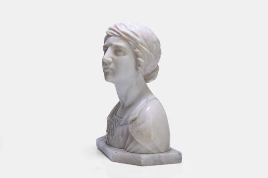General wear throughout, commensurate with age and use. Some scuffs and white spots present. Some minor losses and chips, including to base. Bust securely attached to base. Structurally sound.