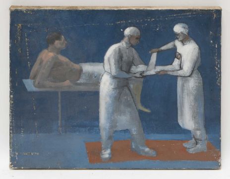 20th century school Wrestlers; Surgeons; Bandaging a Leg three, oil on canvas largest 54 x 61cm, unframed (3)