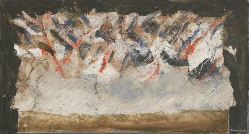 Milnes-Smith began painting in his thirties in a traditional, representational style however quickly moved towards abstraction. In 1957 eight of his works were exhibited alongside other British modernists in Redfern Gallery’s influential show ‘Metavisual Tachiste Abstract’ – a show held in the year following the first major exhibition of American Abstract Expressionists in Britain held at the Tate Gallery. It was around this time that he also began to experiment with combining pieces of paper – paint charts, gallery invitations, and discarded works – with his painted compositions.