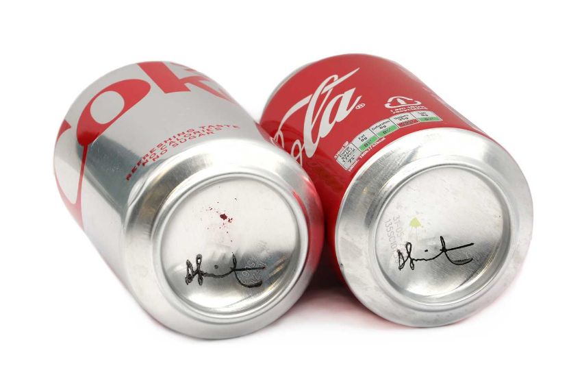 Some denting to edges of Coca Cola can. Small scratches and small paint losses. More denting on Diet Coke can to top and bottom of can, small paint losses and some scratches. In my opinion this does not detract from the artwork.