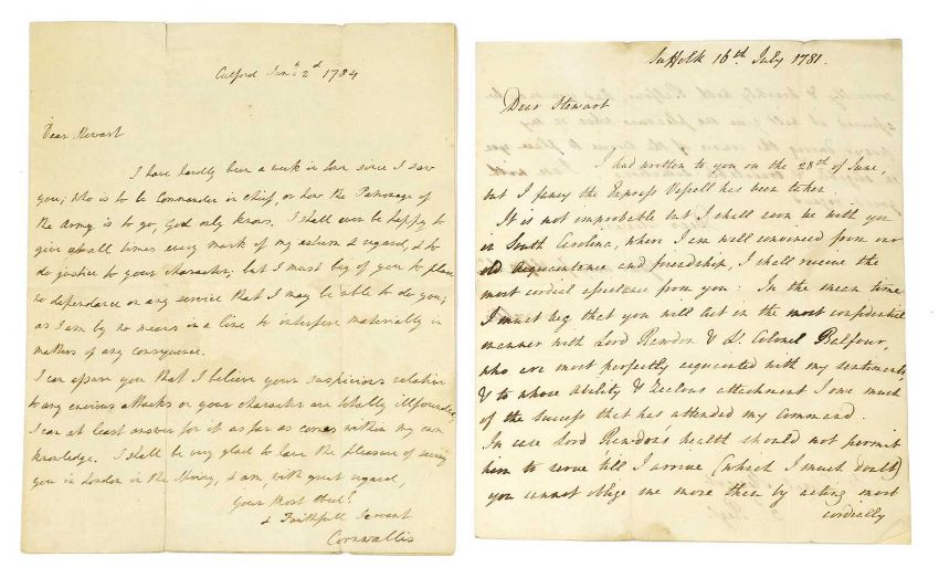 [AMERICAN REVOLUTION] Collection of Letters: CORNWALLIS, Charles, Lord: Two autograph letters Signed to: Lieutenant Colonel Alexander Stewart (16th July, 1781: It is not improbable but I shall soon be with you in South Carolina.. ) & (Jan 2nd 1784). A full transcript of both letters is available; Lieutenant Colonel Alexander Stewart: (Battle of Eutaw Springs): An eight A4 page letter dated: Eutaws, 9th Sept 1781 'Copy of my outlook letter to Lord Cornwallis, after the action at the Eutaws 8th Sept 1781' [NOT SIGNED]: 'My Lord, With particular salutation I have the honor to inform your Lordship that on the morning of the 8th instant I was attacked by the rebel general Green with all the force he could collect in this province and North Carolina- and after an obstinate engagement which lasted near two hours I totally? Defeated him…'; A copy of a three page letter from Stewart to Cornwallis, Signed; Two A4 sheets: 1- A return of the number of officers, non commissioned officers, rank & file, sent out on a shooting? Party from the army commanded by Lieutenant Colonel Alexander Stewart on the morning before the action at Eutaws Sept 8th 1781; 2- A return of the number of officers, non commissioned officers, rank & file, in the action at Eutaws Sept 8th 1781 commanded by Lieutenant Colonel Alexander Stewart; A Copy of a Letter from Lord Kamdon to Col. Balfour, headed: Ninety Six, 27 June 1781. Mentions pursuing “Greene” (Nathanael Greene) passed the broad river at Fiskdan Ford… (With a typed transcript). The original letter with tears to the folds; PLUS: Five other letters from around the same period. (10 items 42 pages including some blank); Plus 2 others, 6 pages (qty.)