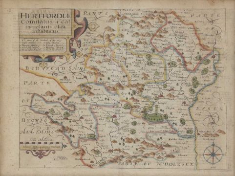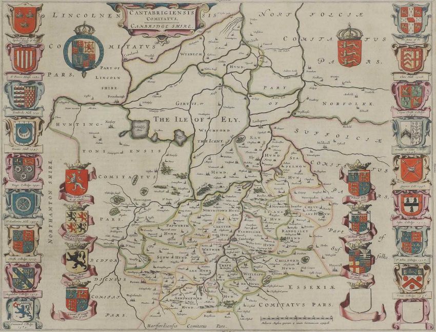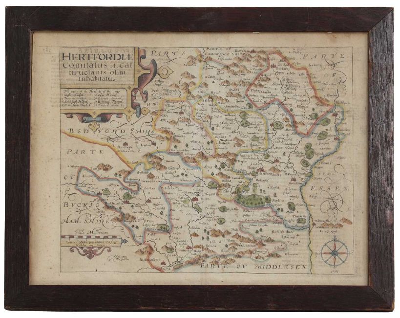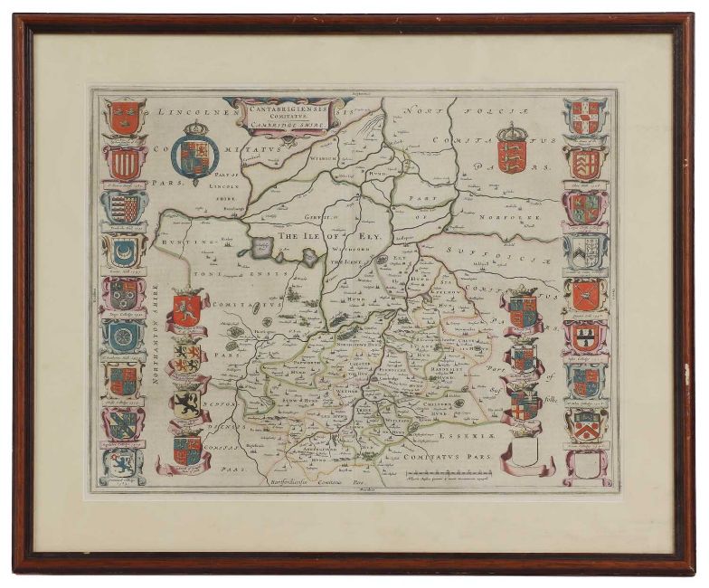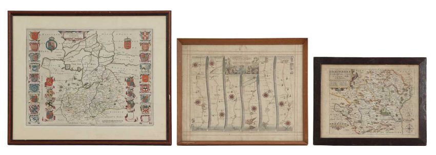 MAPS: Blaeu, J: MAP OF CAMBRIDGESHIRE, CANTABRIGIENSIS COMITATUS, c1645; (52 x 40cm), Plus: Ogilby, J: The Road from Chelmsford in Essex to Maldon.. C1675; (42x32cm); Plus: Morden, J: [Hertfordshire]. Hertfordiæ Comitatus, c1610; (34 x 28cm). All three hand coloured, mounted, framed & glazed. (3)