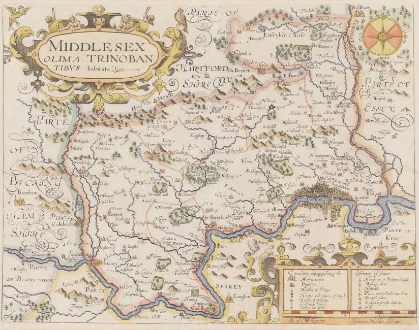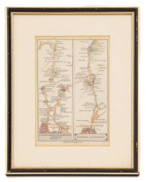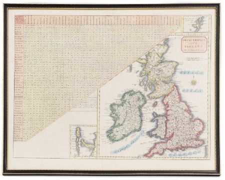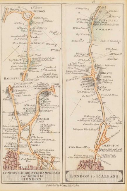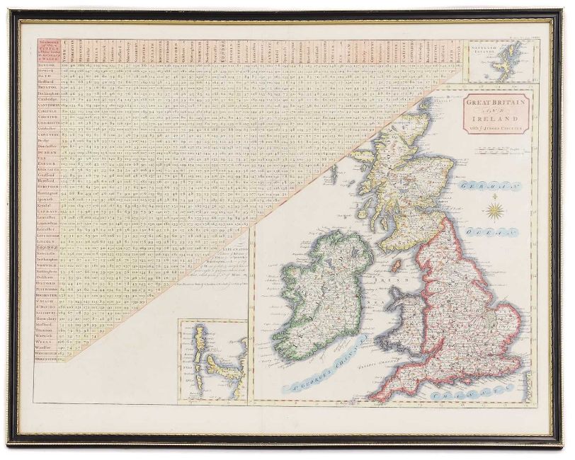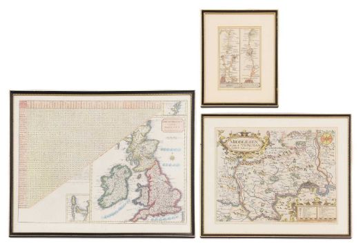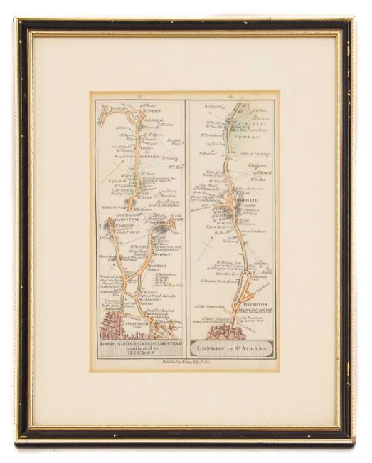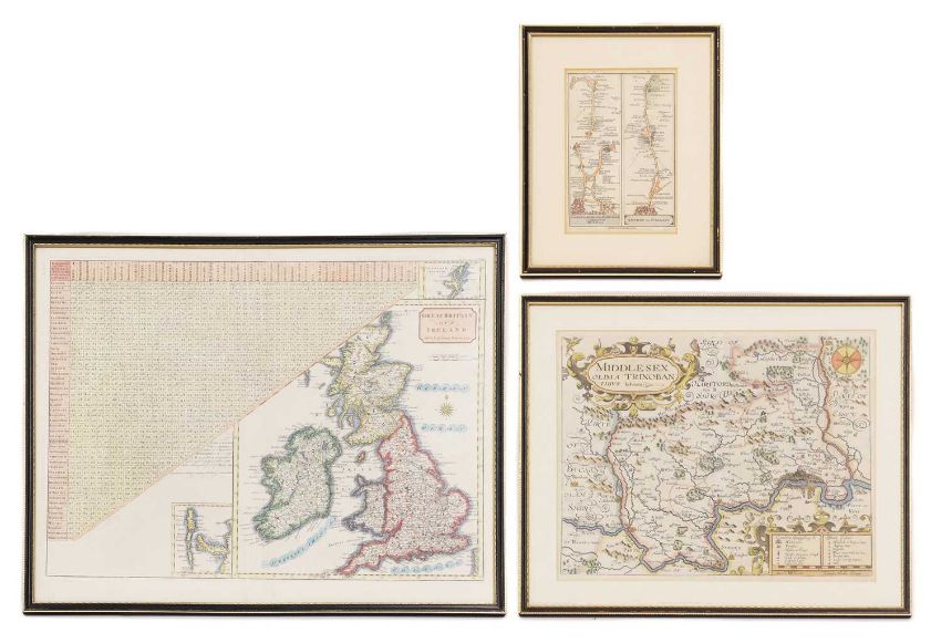 MAPS: MORDEN: Middlesex Olima Trinoban Tibus. (34 x 27cm), hand coloured, mounted, framed & glazed; CARY: Great Britain & Ireland, with Judges Circuits. (47 x 36cm), hand coloured, mounted, framed & glazed; CARY: Road Map: London to Highgate & Hampstead to London; London to St. Albans. (19 x13cm), hand coloured, mounted (3)