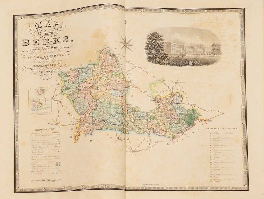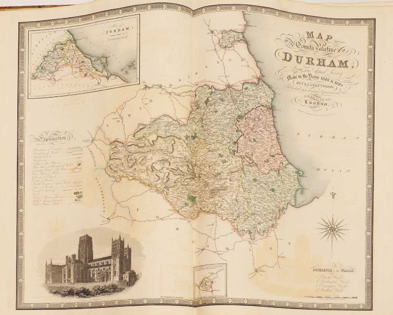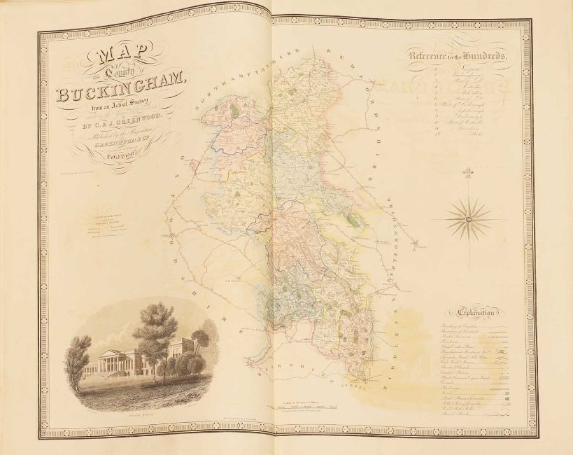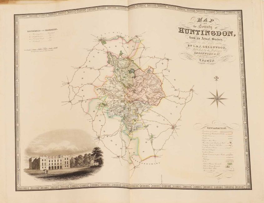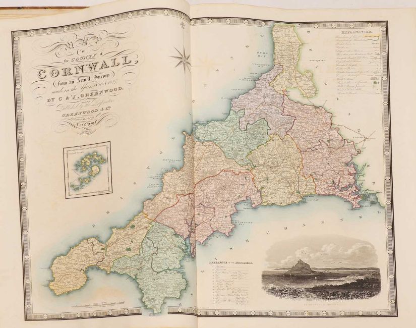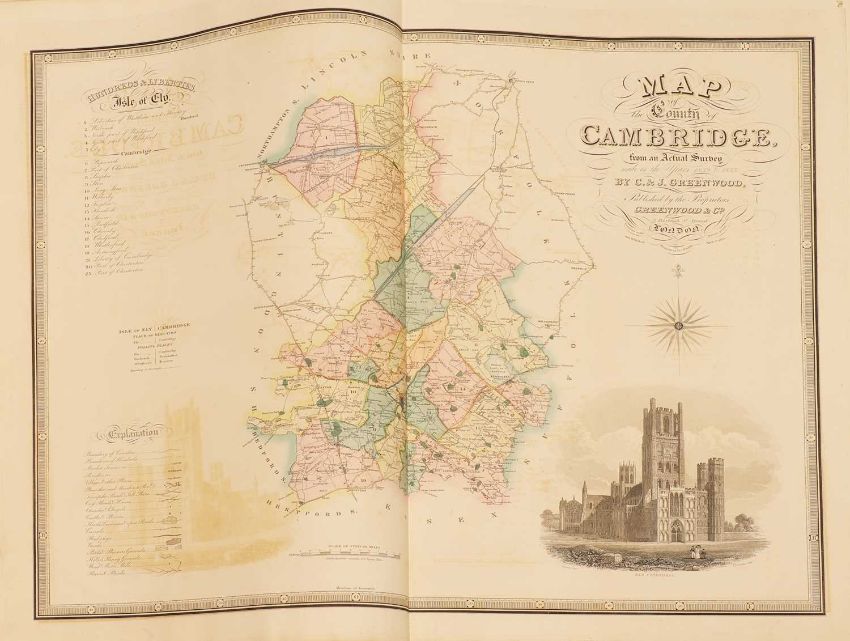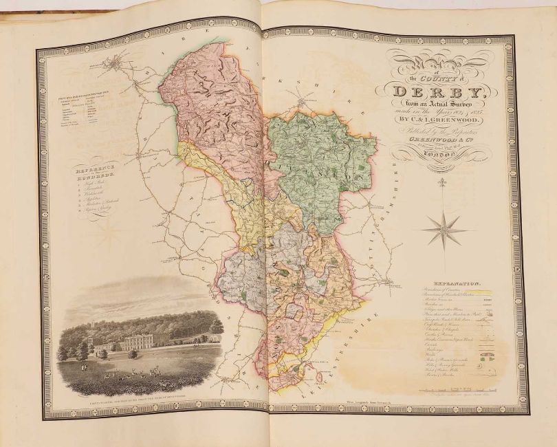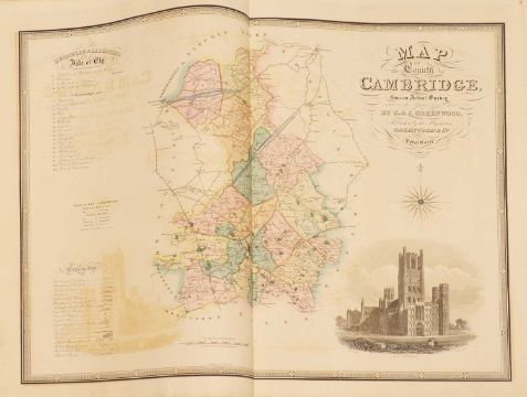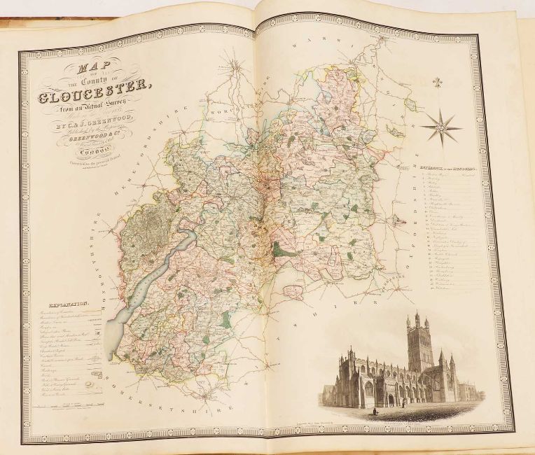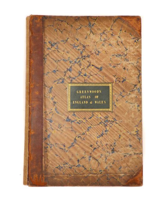 Greenwood: ATLAS of the Counties of England [and Wales] from Actual Surveys made from the Years 1817 to 1833, by C & J Greenwood, April 1834. Most of the maps are dated between 1829-1831. Engraved by JC Walder. Title page Plus 46 double-page hand coloured maps (most with inset view). Elephant Folio (79 x 66cm), offsetting to a few; otherwise bright and clean. Cont. half leather, rubbed and covers detached.