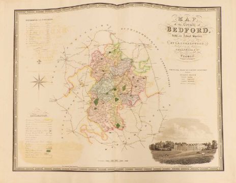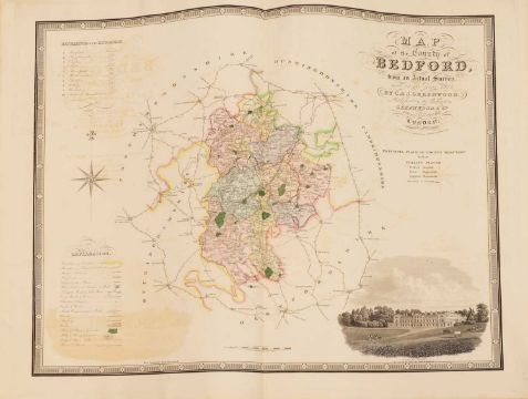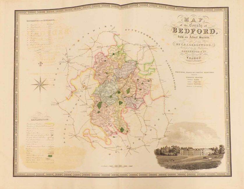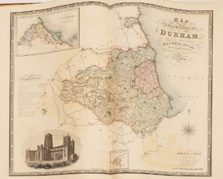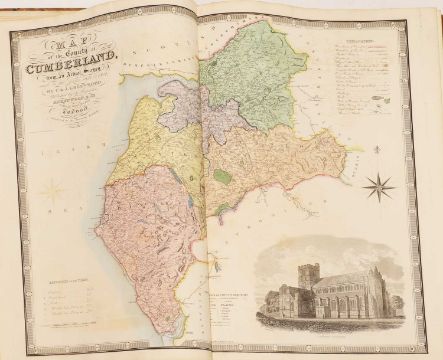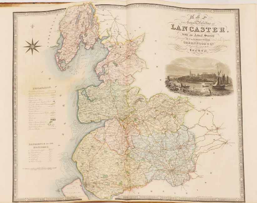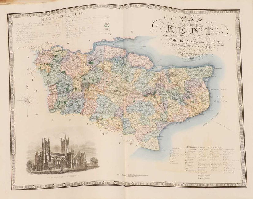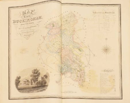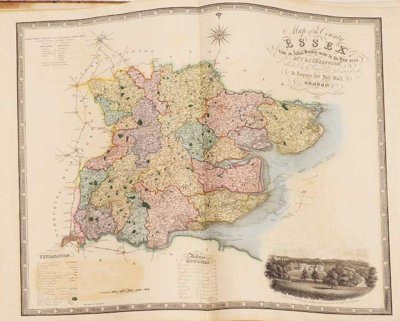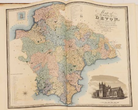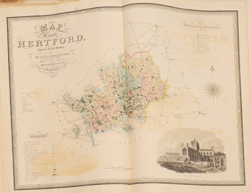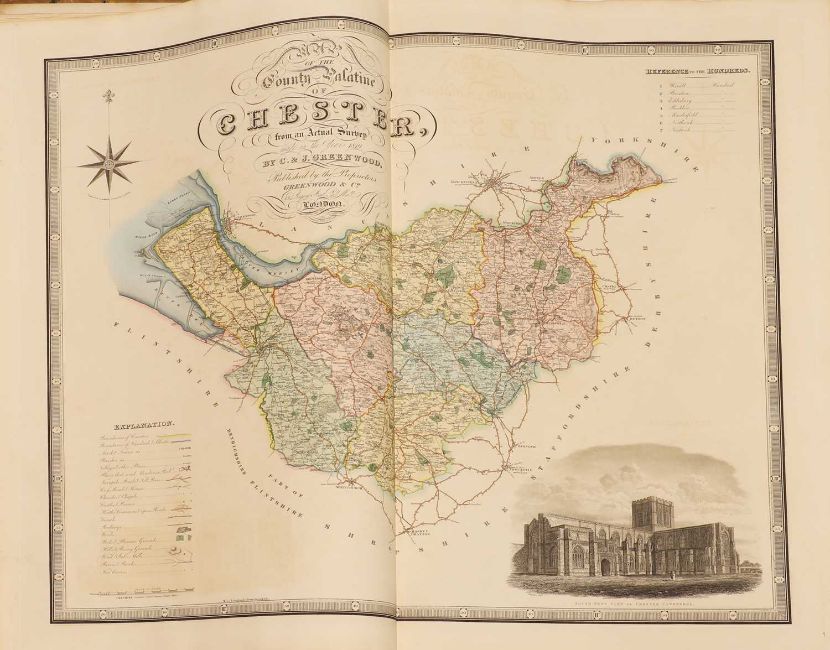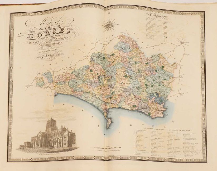 Greenwood: ATLAS of the Counties of England [and Wales] from Actual Surveys made from the Years 1817 to 1833, by C & J Greenwood, April 1834. Most of the maps are dated between 1829-1831. Engraved by JC Walder. Title page Plus 46 double-page hand coloured maps (most with inset view). Elephant Folio (79 x 66cm), offsetting to a few; otherwise bright and clean. Cont. half leather, rubbed and covers detached.