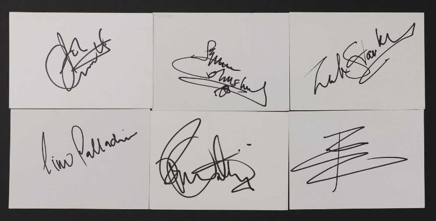 The Who full set: six autographs on white card, 10.5 x 15cm, comprising Roger Daltrey, Pete Townshend, John Entwistle, Simon Townshend, Zak Starkey and Pino Palladino (6)