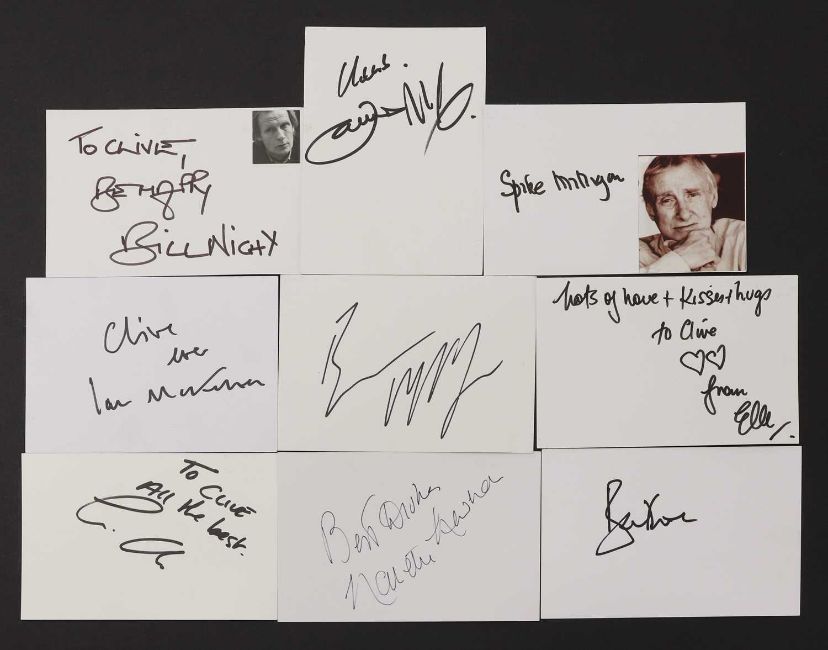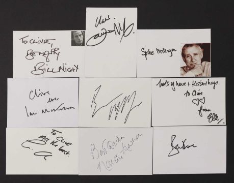 Actors M-O: Approximately eight hundred and ten autographs on white card, 10.5 x 15cm, including Elle MacPherson, James McAvoy, Ewan McGregor, Ian McKellen (x2), Spike Milligan, Roger Moore (x4), Nanette Newman, Bill Nighy and Clive Owen (qty.)