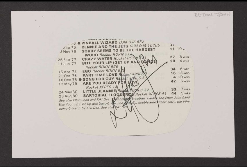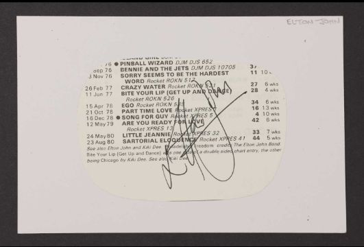 Elton John: autograph signed on record list, attached to white card 10.5 x 15cm