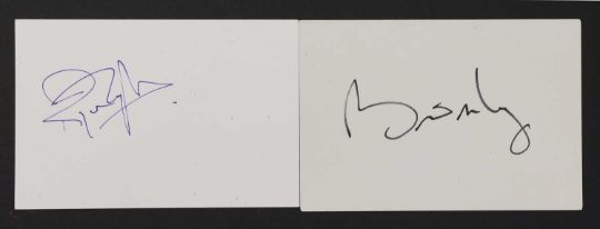 Queen line-ups: two autographs on white card, 10.5 x 15cm, comprising Brian May and Roger Taylor (2)