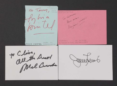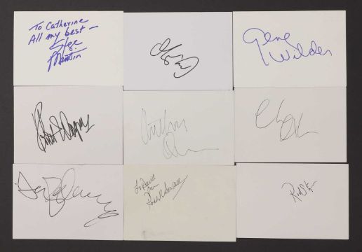 American Comedy Movie Actors: Fifteen autographs on white card, 10.5 x 15cm, including Jerry Lewis, Mel Brooks, Gene Wilder, Adam Sandler, Steve Martin and Chevy Chase, plus twenty-three American movie actors of yesteryear including: Charlton Heston (red paper), Anthony Quinn, Sidney Poitier (green paper), Robert Wagner, Rod Steiger, Roddy McDowall and Jack Palance (38)