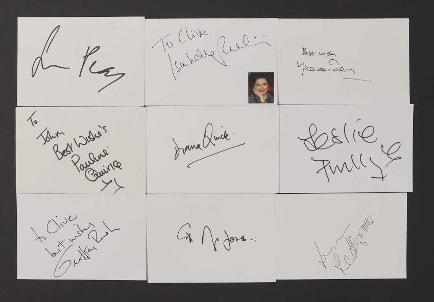 Actors P-R: Approximately six hundred and forty autographs on white card, 10.5 x 15cm, including Michael Palin, Simon Pegg, Leslie Phillips, Diana Quick, Pauline Quirke, Lynn Redgrave, Griff Rhys Jones, Isabella Rossellini and Geoffrey Rush (qty.)