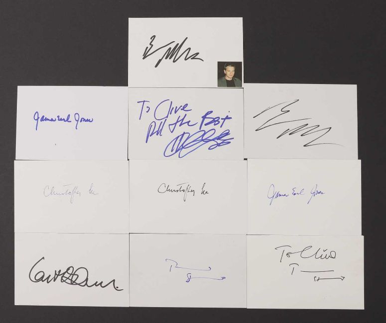 Star Wars: eighteen autographs on white card, 10.5 x 15cm, including Ewan McGregor (x2), Hayden Christensen, James Earl Jones (x2), Christopher Lee (x2), Terence Stamp (x2) and Ian McDiarmid (18)
