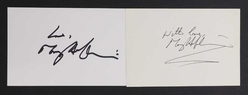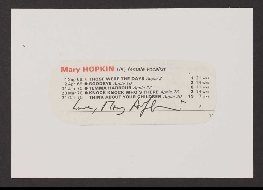 Mary Hopkin on Apple label with the Beatles, autographs x3, one signed on record list attached to white card, 10.5 x 15cm (3)