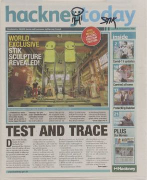 Sold with five copies of 'Hackney Today' newspaper, 21 September 2020, in which they were distributed. One copy signed 'STIK' with a sketch on the front page.