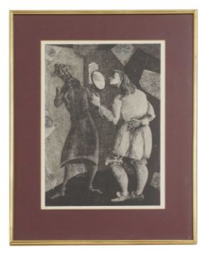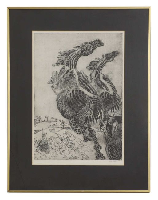 The glazing of 'Two leaping horses' in cracked in the lower left corner. Light time staining and discolouration to the margins of the coloured etchings. Unexamined out of glazed frames.