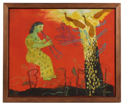 An Indian scene with figures playing instruments overlooked by peacocks in a tree