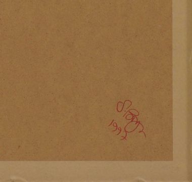 A line of dirty black marks and smudges along the left edge, please see images. Not examined out of glazed frame.