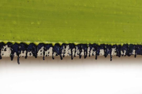 Light surface dirt. A very slight dip in the canvas with slight stretcher marks visible to the left and right edges.