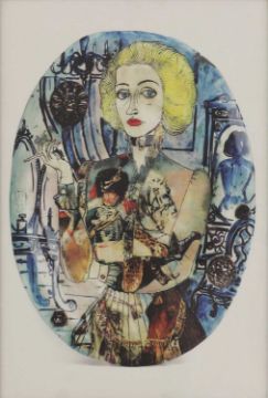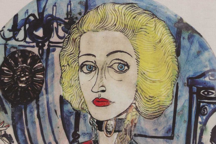 digital print in colours on linen, from a limited edition of 400 tea towels created for the Hayward Gallery that depicts Perry's ceramic work 'Claire as a Soldier,1987'