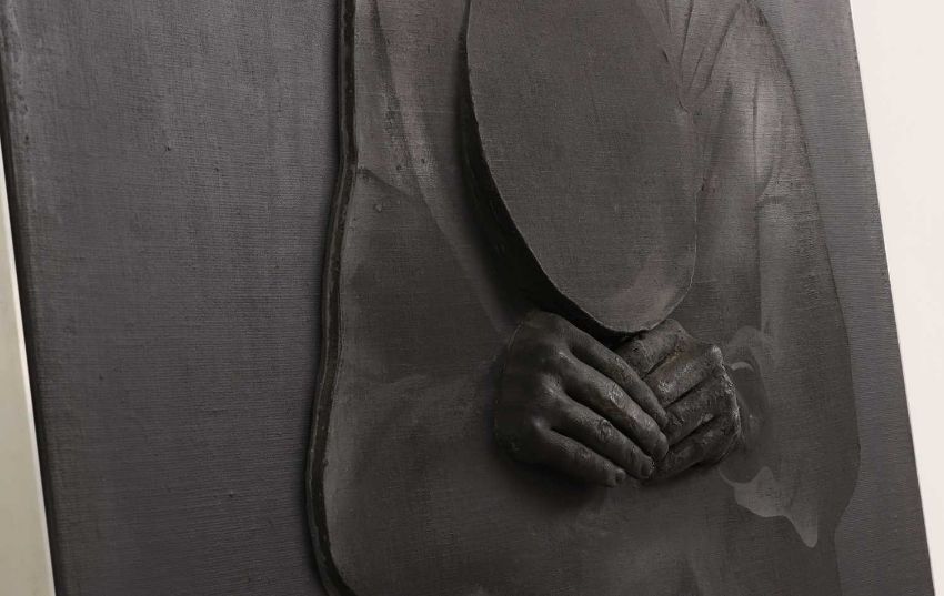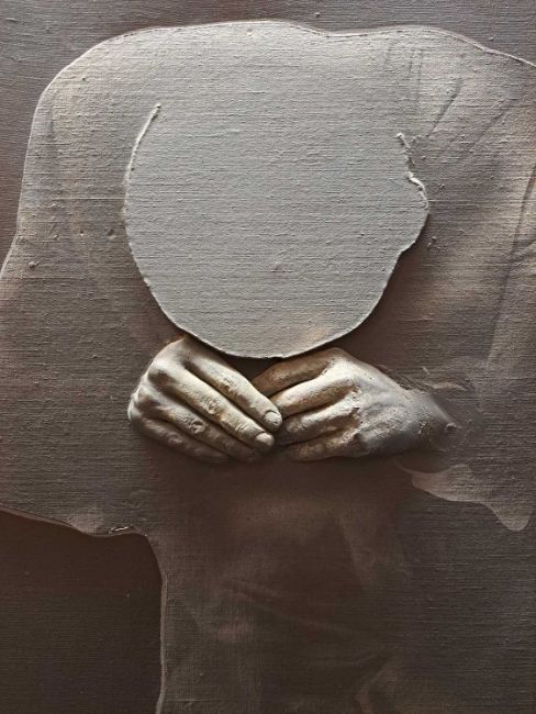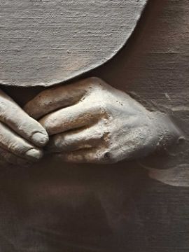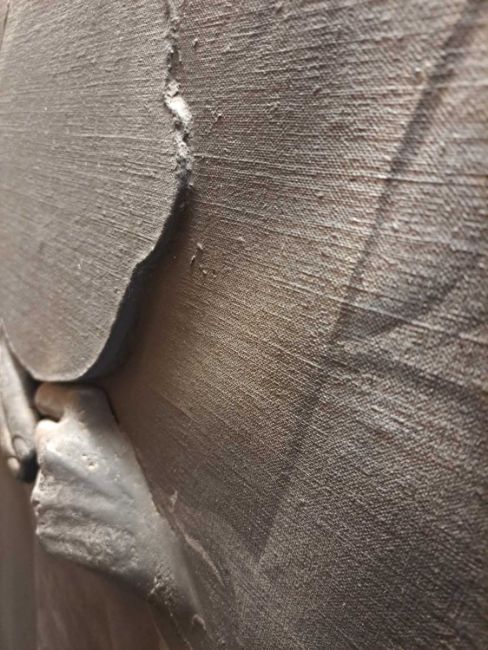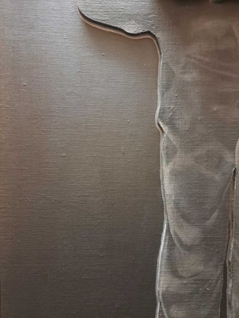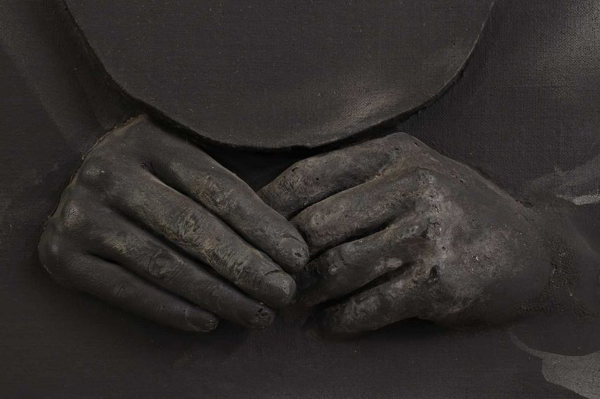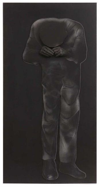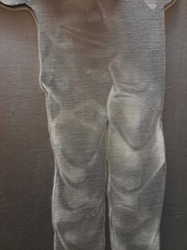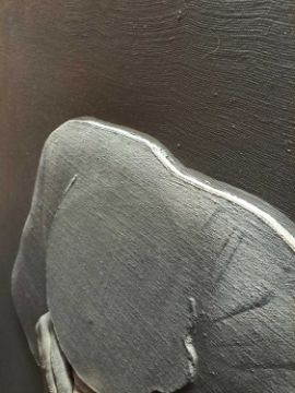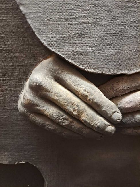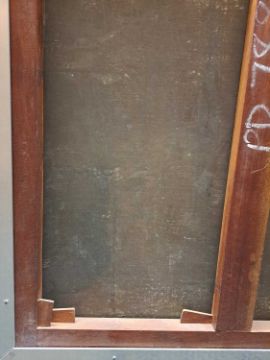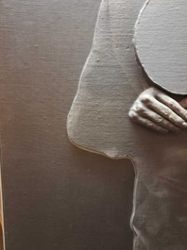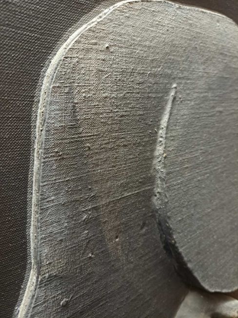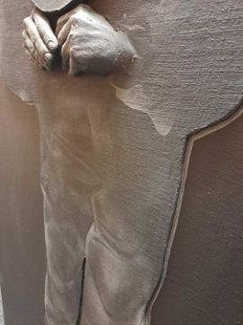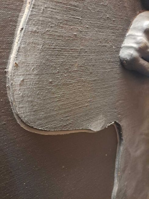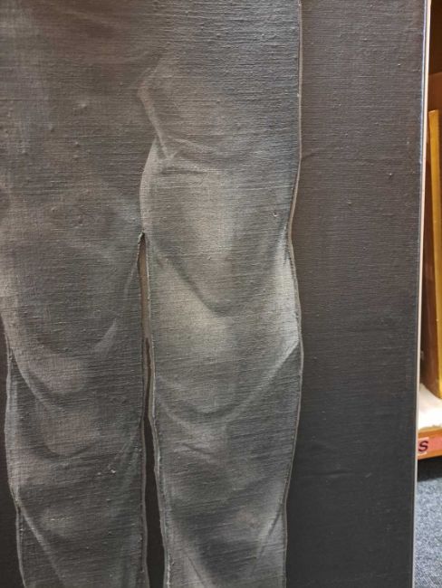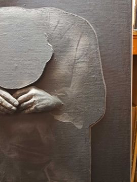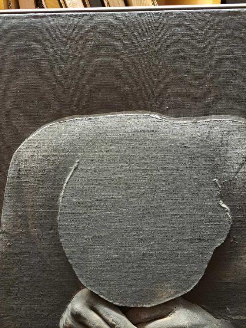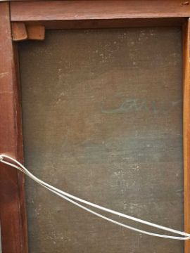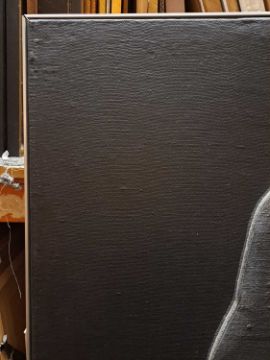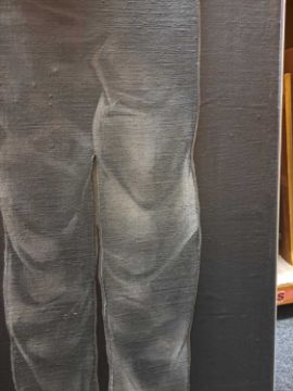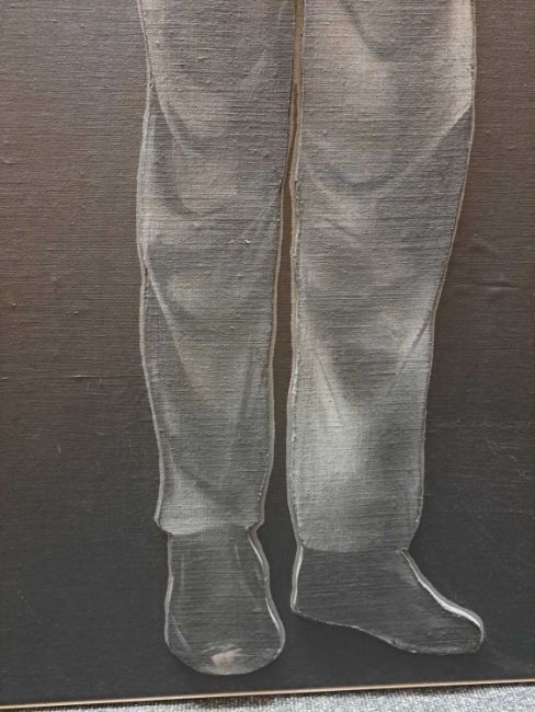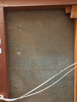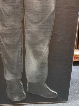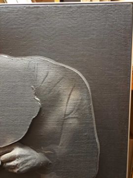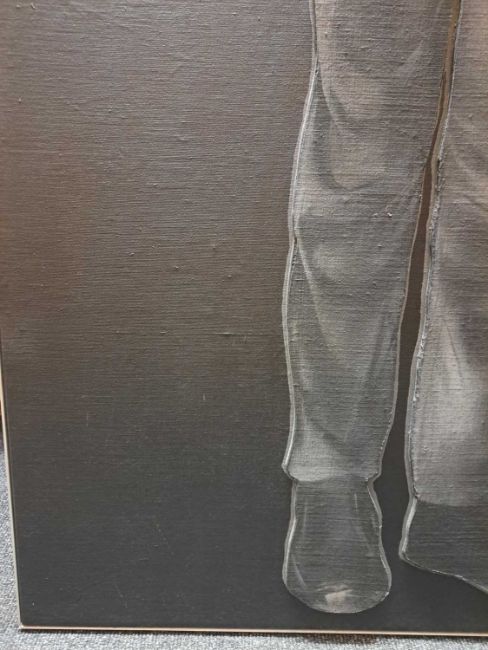 The figure appears to be constructed from polyester and fibreglass which has been mounted on board and painted with oil. The signature is partially obstructed by the stretcher verso.The background is oil on canvas which has some slight creases. Overall the surface of the work is a little rough with some unevenness in texture and finish. Surface dirt with dust and dirt in the crevices.The hands have some small chips and knocks, please see images.