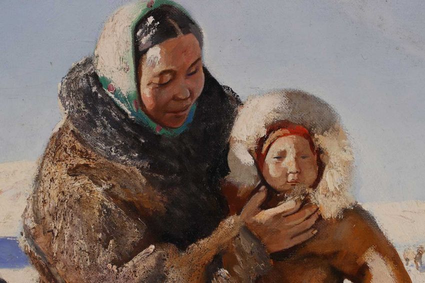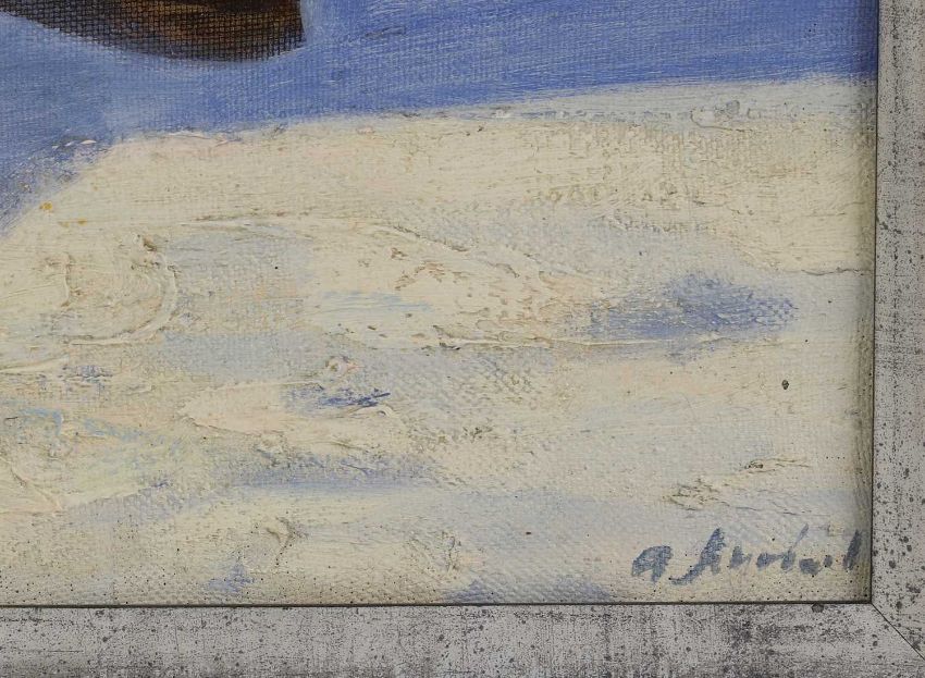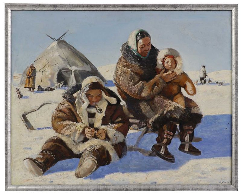 Light surface dirt with some black spots of ink (?) to the blue area just beneath the centre of the right edge. There are some dirty marks and small losses to the right side of the igloo. Cracks to the sky. There is a 38cm diagonal line of cracking starting to emerge to the sky, upper right. Not examined under UV light, for a full report please contact the department.
