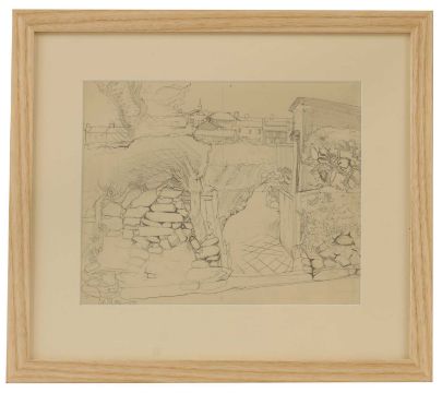 Light time staining. A light 6cm crease mark to the bottom left corner and a small brown dot to the centre of the top edge. The work appears to have been stuck down with a strip of tape applied to the reverse of the top edge which has caused a slight bump in the paper. Presents well overall and is ready to hang. Not viewed out of glazed frame.