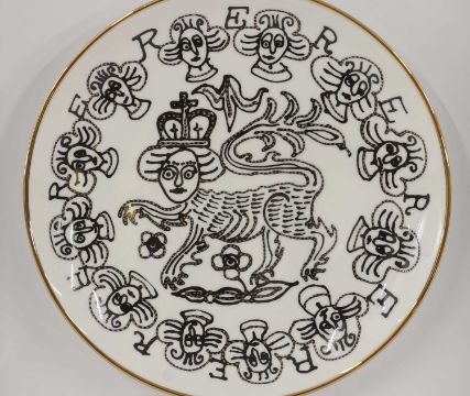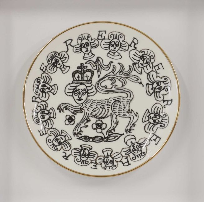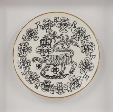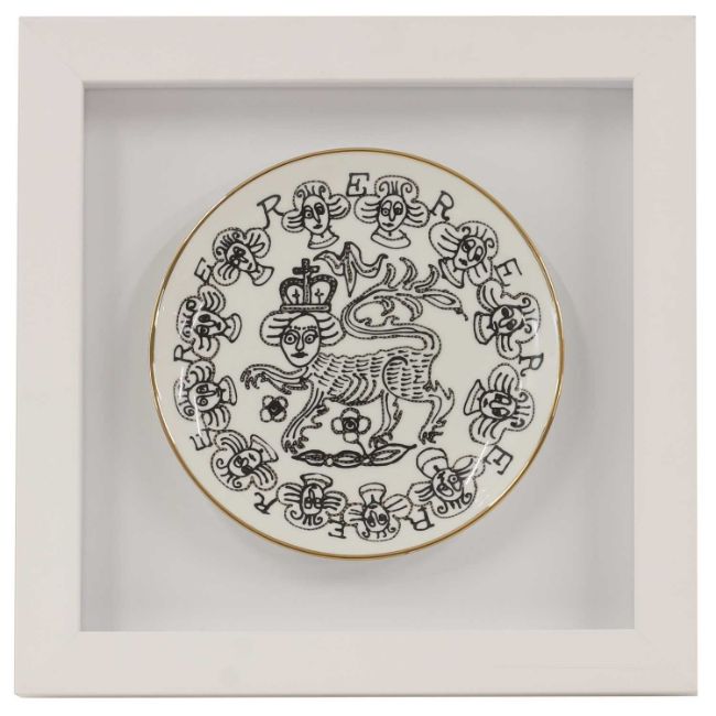 a glazed fine china plate based on the 'Lion Queen Charger' Perry created for the Platinum Jubilee of Queen Elizabeth II, produced for 'Grayson's Art Club: The Exhibition' held at the Midlands Art Centre, Birmingham