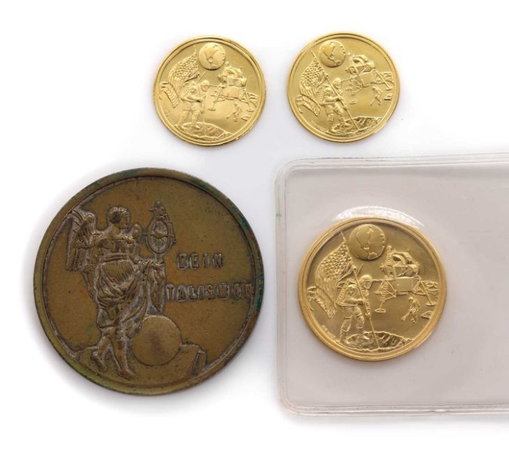 Medals, three 0.999 gold medals commemorating the first moon landing, approx 14 grams, together with a German 'Dein Talisman' (4)