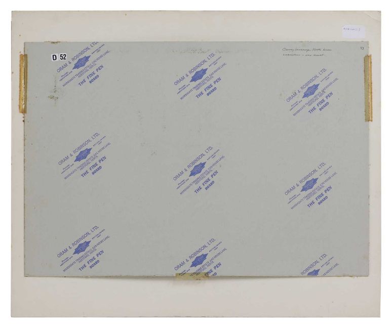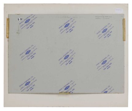 There a some small spots of foxing starting to emerge but the colours are strong and vibrant. The work has been executed on card which has been stuck down at the edges and taped to mount. The mount is acidic which has caused some staining and discolouration to the edges of the work.