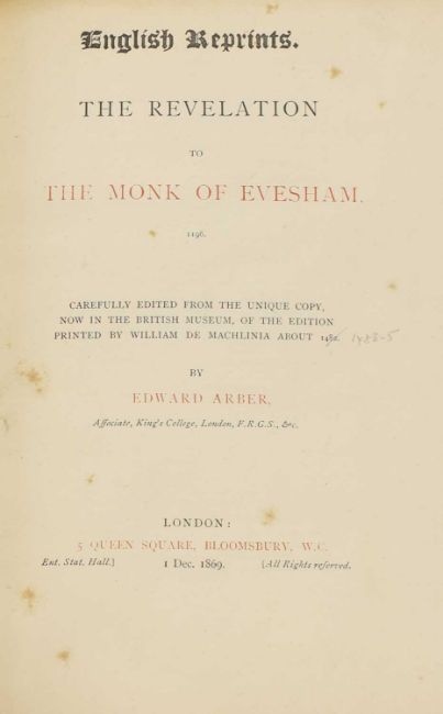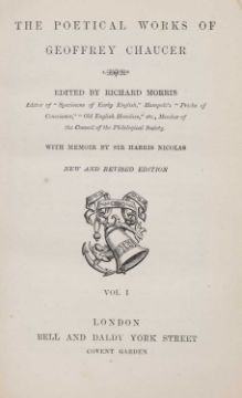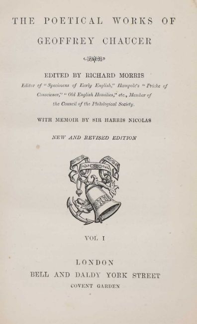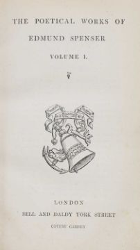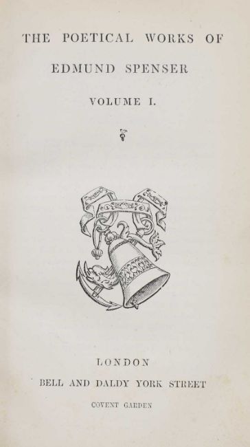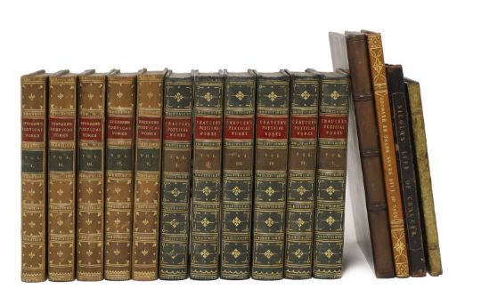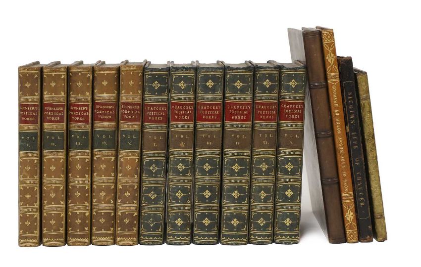 Chaucer: The Poetical works, in 6 vols. Aldine edn. c.1870, Cont. half leather, rubbed; Nicolas, HN: Life of Geoffrey Chaucer. Pickering, 1843, First Separate Edition. Frontis, cont. leather backed boards; rubbed; Spenser: Poetical works, in 5 volumes. Aldine edition, no date c.1880. Cont. half leather, VG; Browning, EB: Sonnets from the Portuguese. 1898. Full leather by Bumpus hand-drawn and coloured initial to front endpaper, dated July 29th. 1880-1890; The most pleasant song of Lady Bessy... 1829, 1st. Edn. Bound by J. Larkins in three-quarter morocco, gilt decoration and lettering to spine. G+; The Revelation to the Monk of Evesham. English Reprints, 1869. Beautiful full calf with embossed design to upper (15)