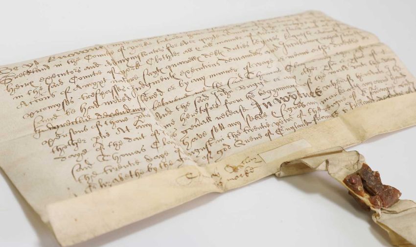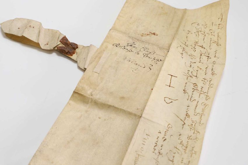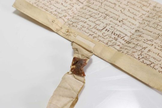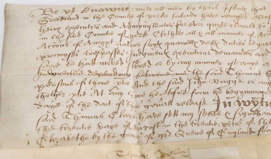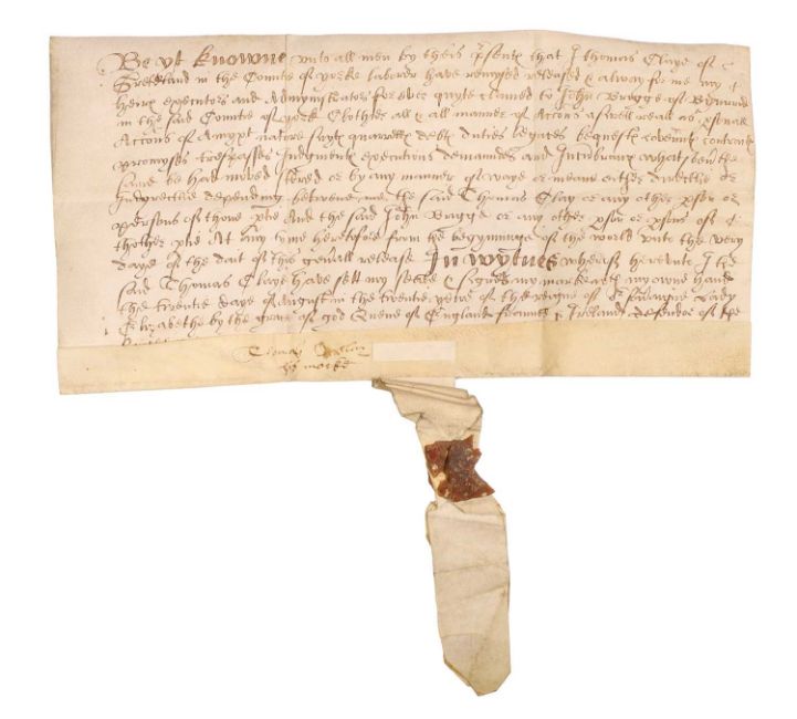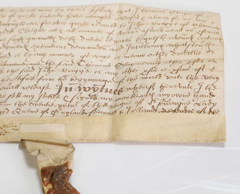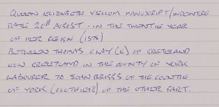 16th Century Indenture on vellum. Dated the 20th. Year of the Reign of Queen Elizabeth, i.e. 1578, Between Thomas Clay(e) of Gretland (now Greetland) in the county of York, labourer to John Briggs.....with the remnant of the wax seal, 24 x 12cm