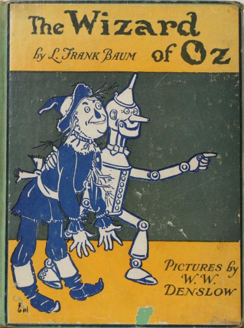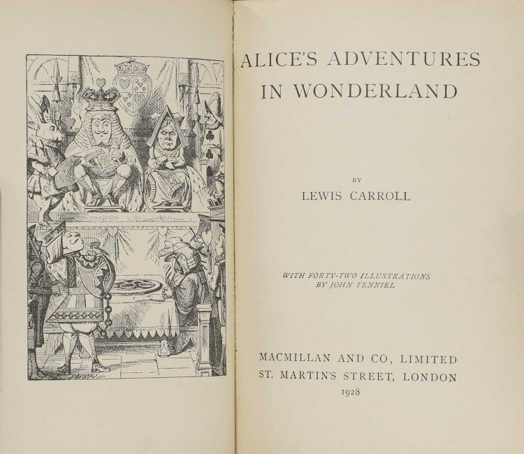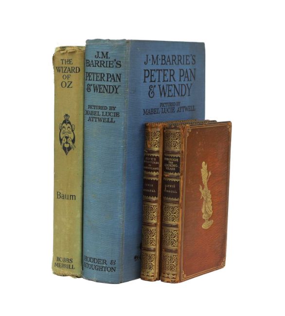 CARROLL, Lewis: Alice's adventures in wonderland, 1928; PLUS: Through the Looking-Glass, 1927. Both in Cont. full leather with gilt decoration to upper covers. Covers rubbed, and hinges cracked; ATTWELL, Mabel Lucie (ill): J M Barrie: Peter Pan and Wendy. Hodder & Stoughton, nd (1921), with 12 tipped-in colour plates. Original blue pictorial boards; rubbed; Baum, L Frank: The New Wizard of Oz. The Bobbs-Merrill Company, Indianapolis, 1903. With 15 plates (8 coloured) (4)