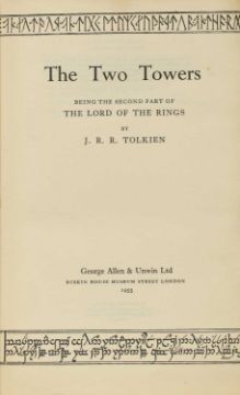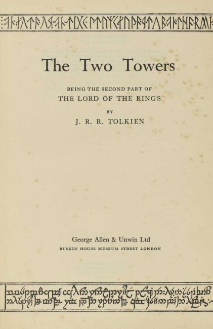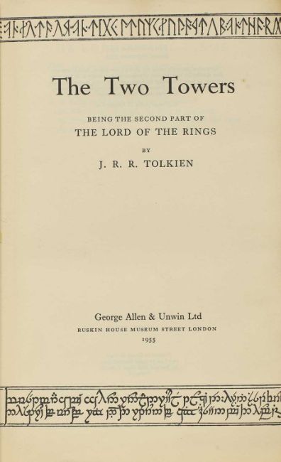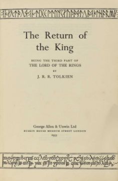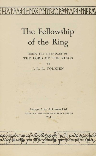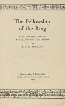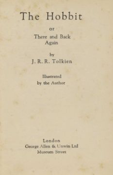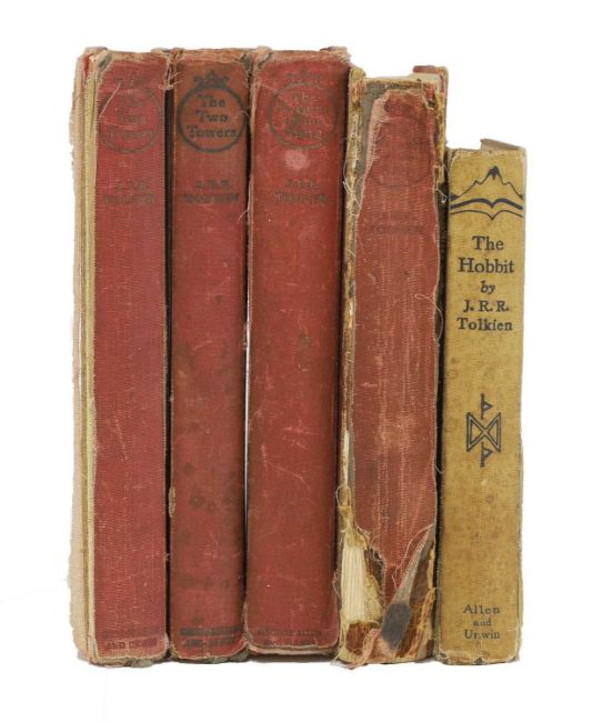 The Hobbit, or There and Back Again. George Allen & Unwin, 1955, 7th Impression. Colour frontis and 8 illustrations (7 are full page), and endpaper maps. Original pictorial cloth, rubbed and tears to spine; The Lord of The Rings, 3 vols. George Allen & Unwin: The Fellowship of the Ring, 1954, 2nd. Impression (same year as 1st Impression); The two Towers, 1955, 2nd. Impression (Two copies); and The Return of The King, 1955, 1st. Impression, Covers rubbed and with tears; Lacking the map in the first volume, but present in the others (5)