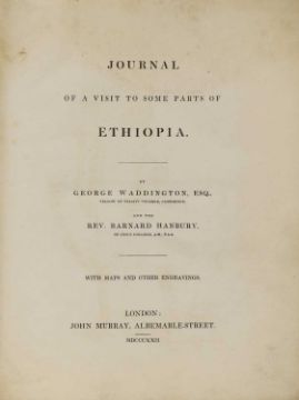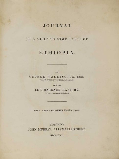Journal of a Visit to Some Parts of Ethiopia. John Murray, 1822, 1st edn. 16 lithographic plates and plans, 2 folding engraved maps. Cont. half leather, rubbed. Damp stain to the two folding maps and one with edges frayed. Scattered spotting