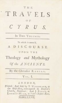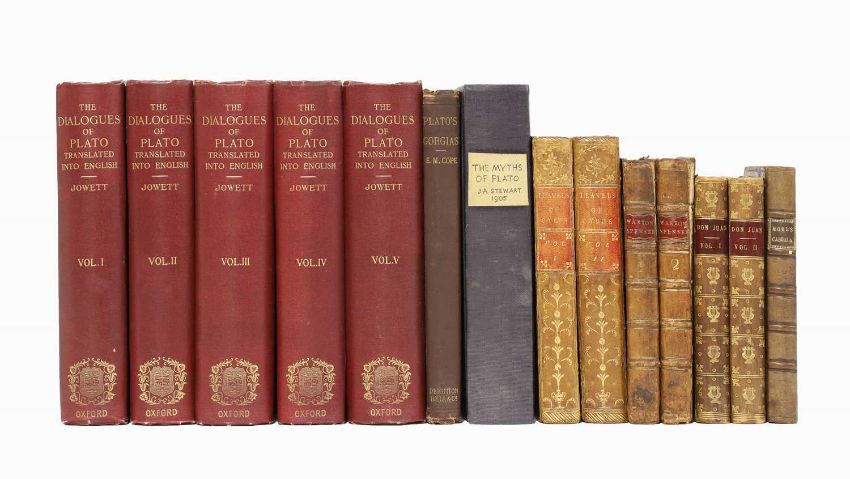 Warton, T: Observations on the Fairy Queen of Spenser, in 2 vols. Dodsley, 1762, Cont. full calf; Chevalier Ramsay: The travels of Cyrus, in 2 vols. Woodward, 1727. Cont. full tree calf; More, Henry: Conjectura Cabbalistica.. Flesher, for Morden, Cambridge bookseller, 1653, Cont. full calf and later spine; Byron's Don Juan, in 2 vols. 1829. Cont. half leather; Jowett: Dialogues of Plato, in 5 vols. Oxford, 1892, Original red boards; Cope: Plato's Gorgias. 1883; and Stewart: Myths of Plato, 1905 (13)