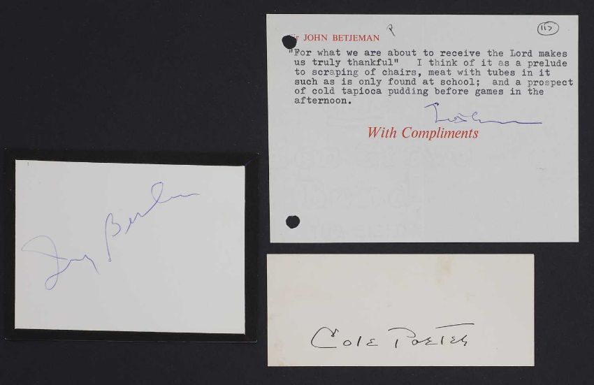 all with Fraser's Certificate of Authenticity, comprising: a John Betjeman typed note, Cole Porter on white card and Irving Berlin on cream card, together with an unsigned black and white photograph (3)